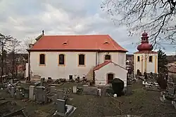 - Zvonice – hranolová zvonice, členěná lizénami a zakončena cibulovou bání stojící vedle kostela. Byly v ní zavěšeny tři zvony od pražského zvonaře Františka Antonína Franka, z nichž dva byly zrekvírovány za první světové války.