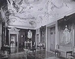 K nejcennějším zámeckým interiérům náleží místnosti západního křídla. Jejich stropy jsou vyzdobeny štukami Santina Bussiho a freskami Andrey Lanzaniho. Pozoruhodný je zejména tzv. Sál předků, vyzdobený monumentální nástropní freskou představující bohy na Olympu. Sál předků je propojen s oválným tzv. Historickým sálem, jenž byl dokončen až v šedesátých letech 18. století iluzivní výmalbou Josefa Pichlera a v němž bylo po bitvě u Slavkova podepsáno příměří mezi Rakouskem a Francií. Zvláštností tohoto sálu je jeho akustická stránka, neboť výstavba byla zamýšlena tak, aby během vysokých politických jednání nebylo slyšet, o čem hovoří jednotlivé shluky diskutujících, kteří stojí v těsné blízkosti.