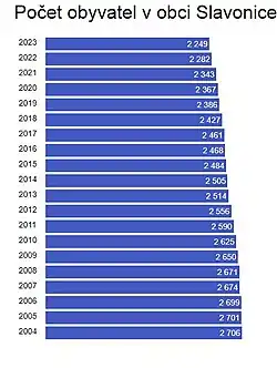 Pro správné posouzení kolísání počtu obyvatel v jednotlivých obdobích je třeba uvést, že v období od roku 1950 do roku 1980 byly v rámci integrace obcí v roce 1964 ke Slavonicím připojeny dříve samostatné obce Vlastkovec, Mutišov a Maříž, později, v roce 1972, byla jako poslední připojena obec Stálkov.