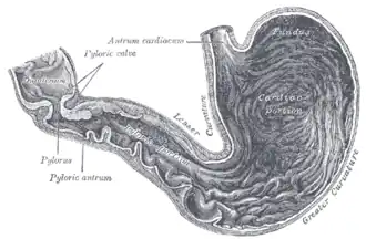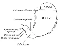 - pars pylorica – distální úsek, nejužší, přechází v duodenum