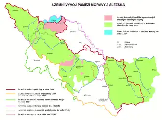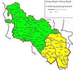 Slezsko: fialově vyznačeno současné Polské Slezsko, šedě vyznačeno současné České Slezsko, tyrkysový okraj: habsburské Slezsko před rokem 1742, žlutý okraj: pruská provincie Slezsko