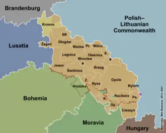 Slezsko v původních středověkých hranicích, tj. bez Kladska a lužických oblastí, s Krosenskem a Sulechówskem