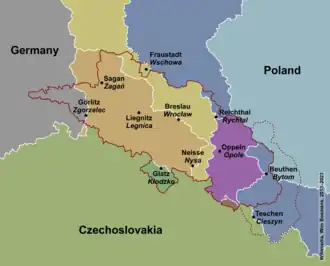 Československo-polský spor o Těšínsko vygradoval v lednu 1919 do podoby sedmidenní války, následně se měl konat plebiscit, od nějž bylo nakonec upuštěno a bývalé Těšínské knížectví rozdělila Konference velvyslanců dne 28. července 1920 na dvě zhruba rovné části s tím, že ostravsko-karvinský uhelný revír a Košicko-bohumínská dráha připadly Československu a samotný Těšín byl rozpůlen podél řeky Olše. Bez hlasování a proti vůli obyvatelstva přiznala Versailleská smlouva Československu Hlučínsko – jižní část bývalého pruského okresu Ratiboř. Dále se součástí československého státu stala ostatní území Rakouského Slezska s Opavou, Krnovem a Jeseníkem i přesto, že se tamní obyvatelstvo ze začátku pokoušelo o sjednocení s Německým Rakouskem. Plebiscit se naopak uskutečnil 20. března 1921 v Pruském Slezsku na celém území vládního obvodu Opolí s výjimkou okresu Nisa, Falkenberg, Hlučínska a části Prudnicka. 40,4 % hlasujících se vyslovilo pro připojení k Polsku, 59,6 % zvolilo setrvání v Německu, přičemž Polsko podpořily zejména venkovské oblasti na jihovýchodě plebiscitního území, kdežto Německo západ, sever a všechna větší města.[15] Vyznačení hranic přesně podle výsledků hlasování se jevilo jako neproveditelné a zároveň by bylo neuspokojivé pro obě strany, proto o rozdělení regionu nakonec rozhodla Rada Společnosti národů v říjnu 1921 (s platností od roku 1922). Polsku připadla třetina sporného území (ovšem s polovinou obyvatel a většinou průmyslu) a došlo k rozdělení hlavní průmyslové aglomerace: Bytom, Zabrze a Hlivice zůstaly na německé straně, ostatní města včetně Katovic byla připojena k Polsku. Spor doprovázely tři ozbrojené střety mezi propolskými iredentisty a příslušníky německých paramilitantních organizací (Grenzschutz Ost, Bojová organizace Horního Slezska) známé jako hornoslezská povstání. Od Německa ve prospěch Polska odpadla po první světové válce také okrajová území v Dolním Slezsku: Rychtalsko, část Sycovska a několik pohraničních obcí.