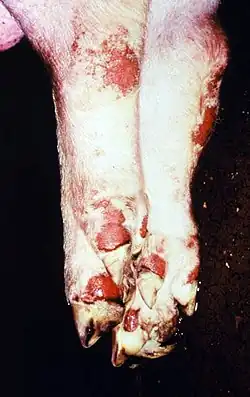 - ↑ a b c Kitching P., Alexandersen S. Clinical variation in foot-and-mouth disease: pigs. Rev Sci Tech Off Int Epizoot. 2002, roč. 21, čís. 3, s. 513–518. PMID 12523692.