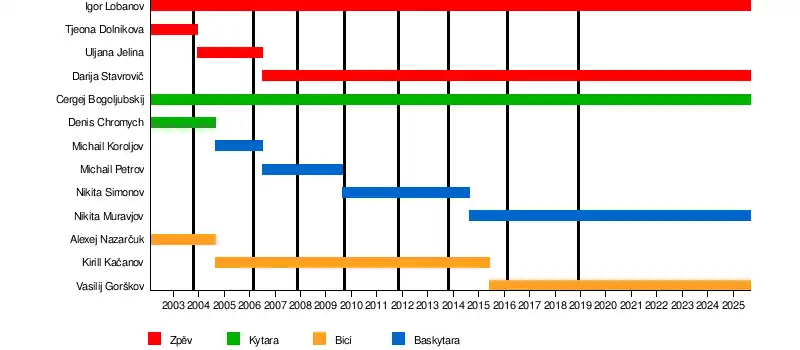 Darija (Nuki) Stavrovič (zpěv) Igor (Keš) Lobanov (zpěv) Vasilij (Ghost) Gorškov (bubeník) Sergej (ID) Bogoljubskij (kytara) Nikita Muravjev (bas-kytara) | |