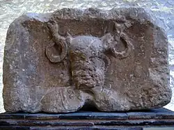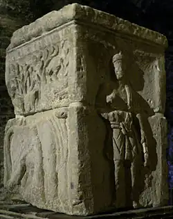 Ze třetího kvádru se dochovala pouze horní polovina, na které je dedikační nápis. Spodní část nápisu tedy není známá. Na dvou stranách bloku jsou vždy vyobrazeni tři muži se štíty a oštěpy. Jednu skupinu tvoří oholení lidé, na druhé jsou vousatí s nadpisem EVRISES. Další skupinu tvoří nejméně tři osoby, z nichž jedna je interpretována jako žena pod neúplným nápisem SENAN, který může být i pokračováním hlavního nápisu.