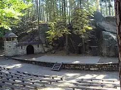 - V roce 1921 bylo u obce směrem k Zákupům vytvořeno lesní kamenné divadlo, kde svou mateřskou scénu nalezl divadelní spolek Sloup. V letech 1957 až 1959 bylo znovu upraveno, po roce 1960 bylo zapomenuté pozvolna devastováno. Až v roce 2004 byl areál opraven a uveden opět do divadelního provozu.[22]. Poblíž divadla na rozcestí s Restaurací U sedmi trpaslíků začíná horní část Cikánského dolu.