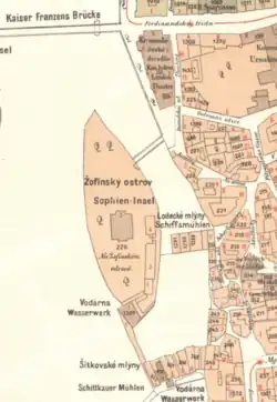 - Žofínský ostrov (německy Sofieninsel), Žofín – podle arcivévodkyně Žofie (1805–1872), matky císaře Františka Josefa I.