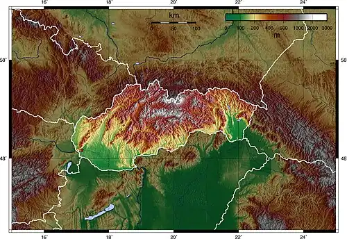 Severním a středním oblastem Slovenska dominují na především rozsáhlé horské masivy,[59] které jsou součástí Západních Karpat.[60] Ty se dělí na tři části – Vnější, Střední a Vnitřní.[61] Vnější Západní Karpaty se nacházejí na severu a zahrnují Malé Karpaty, Javorníky a Beskydy. Střední Západní Karpaty se skládají z Vysokých a Nízkých Tater. Vnitřní Karpaty postupují dále na jih do Maďarska. Jejich součástí je především Slovenské rudohoří. V západních oblastech převládají spíše kopce.[58] Níže položené oblasti jsou ve velké většině na jihu při hranicích s Maďarskem. Dvě nejvýznamnější z nich představují Podunajská a Východoslovenská nížina.[60] Nejvyšším bodem je Gerlachovský štít ve Vysokých Tatrách, dosahující výšky 2 654 m.[62]