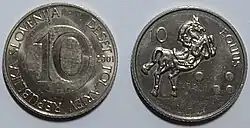 10 tolarjev | 22 mm | 2 mm | 5,75 g | 75 % mědi, 25 % niklu |