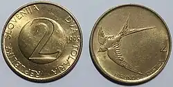 2 tolarja | 24 mm | 1,7 mm | 5,4 g | Vlaštovka obecná, „HIRUNDO RUSTICA“ | |||||