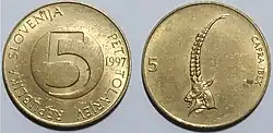 5 tolarjev | 26 mm | 1,7 mm | 6,4 g | Kozorožec horský, „CAPRA IBEX“ | |||||