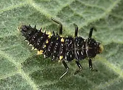 Larvy jsou černé s bílými znaky, mají kuželovité výčnělky na těle a krátké nohy. Kukla je také charakteristická svým zbarvením a tvarem.