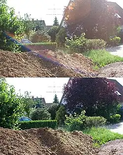 Působení světla ze světelného zdroje přímo do objektivu se na snímku projeví zobrazením jednoho nebo více barevných fleků, pravděpodobně clonového otvoru, obvykle kulatého nebo šestiúhelníkového tvaru. Jsou vytvořeny nežádoucími odlesky ve fotoaparátu, tzv.„prasátky“ (lens flares), a závisejí na kvalitě objektivu a odrazech uvnitř těla fotoaparátu. Tento účinek lze obvykle účinně snížit sluneční clonou a kvalitní antireflexní vrstvou na čočce.[5] Je možné s těmito fleky experimentovat, ale někdy dokáží obraz zničit. V některých případech jsou tyto efekty využívány jako záměrný vyjadřovací výtvarný prostředek a existují filtry, které je způsobují uměle.