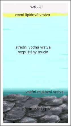 - Vnitřní mukózní vrstva je tvořena glykoprotieny. Umožňuje hladké roztírání vodné složky slzného filmu rovnoměrně po celém povrchu oka a zajišťuje přilnavost slzného filmu k povrchu oka. Vzniká sekrecí pohárkových buněk spojivky.[2]