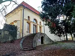 Řopík s protitankovými zátarasy u zdi zámeckého parku