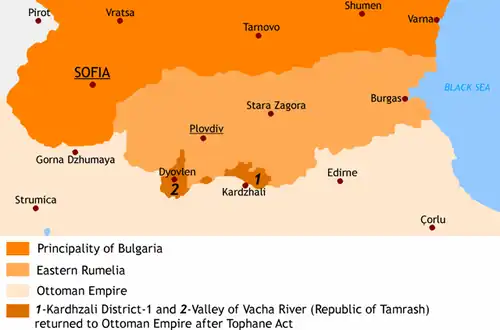 - ↑ a b HERTSLET, Edward. The Map of Europe by Treaty. Londýn: Her Majesty's Stationery Office, 1891. 3380 s. Dostupné online. Kapitola Act agreed between the Plenipotentiaries of Great Britain, Austria-Hungary, France, Germany, Italy, Russia, and Turkey, for modifying Articles XV and XVII of the Treaty of Berlin; Governor-Generalship of Eastern Rumelia to be entrusted to the Prince of Bulgaria, and Musulman Villages of Kirdjali and those of Rhodope District to be placed under administration of the Porte, Constantinople, 5th April 1886, s. 3152–3157. (anglicky)