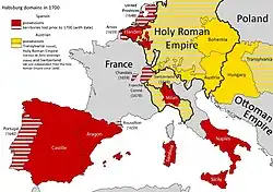 Italské války mezi dynastií Valois a Habsburky začaly v roce 1494 a trvaly více než 60 let. Po většinu tohoto období ovládal Španělsko a Svatou říši římskou císař Karel V., dokud v lednu 1556 neabdikoval a nerozdělil své državy. Země habsburské monarchie, často označované jako „Rakousko“, připadly jeho bratru Ferdinandovi, který byl zároveň zvolen císařem Svaté říše římské. Jeho syn Filip II. Španělský, který se v červenci 1554 oženil s Marií I. Anglickou, už vládl Nizozemí a Milánsku. K těmto državám byly přidány Španělská říše, Neapolsko, Sicílie a Sardinie.[2]