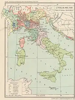 Po skončení konfliktu byla Itálie rozdělena mezi místokrálovství španělských Habsburků na jihu a formální léna císařské koruny na severu. Císařským státům vládl rod Medicejů v Toskánsku, španělští Habsburkové v Miláně, rod Este v Modeně a Savojští v Piemontu (kteří v roce 1562 přesunuli své hlavní město do Turína).[42] Neapolské, Sicilské a Sardinské království bylo pod přímou nadvládou španělských Habsburků.