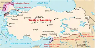 Lausannská smlouva určila územní uspořádání moderního Turecka.[1] Upřesnila turecké hranice a nařídila přesuny obyvatelstva, které začaly už předtím arménskou a řeckou genocidou.[2]