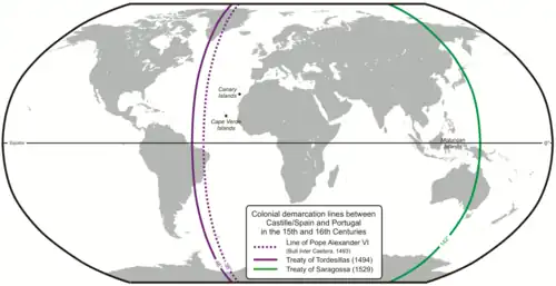 Papež tím chtěl zabránit ozbrojenému střetu mezi tehdy vedoucími katolickými námořními mocnostmi. Již Kalixt III. rozdělil v r. 1456 svět mezi Kastilii a Portugalsko rovnoběžkou vedoucí přes mys Bojador (ar. بوجدور [Búdždúr]). Na toto dělení navázala papežská bula Aeterni regis z roku 1481, která přiřkla oblast jižně od Kanárských ostrovů Portugalsku. Papež Alexandr VI. (Rodrigo Borgia) v bule Inter caetera (květen 1493) stanovil dělicí linii ve vzdálenosti 100 leguas (asi 480 km) západně od Kapverd. Linie probíhala severojižním směrem Atlantikem. Všechna území západně od ní (Amerika) měla být vlastnictvím Španělska, všechna území na východ (Afrika, Asie) měla připadnout Portugalsku. Proti tomu se postavil portugalský král Jan II. V následujících tvrdých jednáních, která vedl astronom, kartograf a námořník Duarte Pacheco Pereira, se Portugalcům podařilo posunout linii na 370 španělských leguas (asi 1770 km) západně od Kapverd. Nová hraniční linie umožnila Portugalcům kolonizovat část Brazílie ležící na východ od ní. Existuje domněnka, že Portugalci již při těchto jednáních o existenci Brazílie věděli.