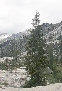 Smrk Brewerův s typicky převislými větvičkamiSekce Omorikae (ploché jehlice s bílými průduchovými proužky)