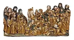 Reliéf z lipového dřeva o rozměrech 54 × 108 × 10,5 cm je sestaven ze čtyř desek. Chybí levá ruka Panny Marie, obě ruce sv. Jana, pravá ruka sv. Petra, levá ruka apoštola u hlavy lůžka, křídla andělíčka, poutnická hůl sv. Jakuba.[1] Polychromie i zlacení je původní, z počátku 16. století. Reliéf byl restaurován K. Stádníkem (1970), J. Živným (1994) a P. Blattným (2008).