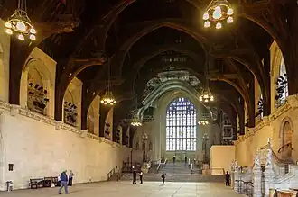 Ve Westminster Hall byli přítomni členové obou komor parlamentu, kteří přihlíželi, jak gardisté nesou rakev do sálu. Průvod do sálu vedli zbrojní důstojníci, Gentleman Usher of the Black Rod (Brian Horrocks), ministr prací (David Eccles), hrabě Maršál, lord Velký komoří (James Heathcote-Drummond-Willoughby, 3. hrabě z Ancasteru) a bezprostředně před rakví děkan Westmisterského opatství (Alan Don) a arcibiskup z Yorku (Cyril Garbett). Za rakví následovali Alžběta II. a královna Marie, královna Alžběta a princezna Margaret (všechny přijely autem z Buckinghamského paláce). Bohoslužbu vedl arcibiskup z Yorku.[7]