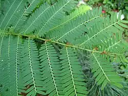 Strom vysoký 5 až 10 m s kmenem o průměru do 30 cm, jeho hladká kůra je světle šedá až hnědá s řídkými lenticelami. Z hlavních klenutých, oblých větví vyrůstají krátké, slabě hranaté a hustě olistěné tenké větvičky 10 až 20 cm dlouhé, které opadávají i s listy; toto uspořádaní připomíná listy zpeřené. Drobné listy jsou podlouhlého tvaru s drobnými opadavými palisty, vyrůstají ve dvou řadách těsně proti sobě, bývá jich na větvičce 80 až 150, jsou kratičce řapíkaté a čepele mívají obvykle menší než 2 × 0,5 cm, na bázi jsou mělce srdčité až kulaté a vrcholu tupé či špičaté, po obvodě bývají celistvé nebo zubaté a někdy slabě podvinuté, na rubu jsou světlejší a jejich zpeřená žilnatina mívá okolo 5 párů žilek. Strom střídavě vyměňuje listy, obvykle však ne všechny najednou, proto bývá uváděn jako opadavý i stálezelený.