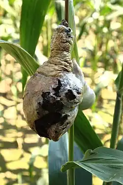 Huitlacoche, hálky sněti kukuřičné mohou být napadeny patogenem, houbou rodu kropidlák Aspergillus, ale hálky mohou napadat také bakterie.[7]