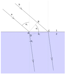 Z obrázku je vidět, že vlnění, které dopadá z prostředí 1 na rozhraní s prostředím 2 pod úhlem dopadu , dospěje nejdříve do bodu a postupně do dalších bodů až po bod . Tyto body se podle Huygensova principu stávají zdroji elementárních vlnění, které se šíří do prostředí 2. Dochází k lomu vlnění. Vlnění, které se v prostředí 1 šířilo fázovou rychlostí , se bude v prostředí 2 šířit fázovou rychlostí , která je obecně různá od rychlosti a závisí na vlastnostech prostředí, v němž se vlnění šíří. Čelo dopadající rovinné vlny (tedy vlnoplocha) je představováno úsečkou , čelo lomené vlny je představováno úsečkou . Pro poměr sinů úhlu dopadu a lomu platí podle obrázku vztah