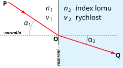 Úhly se vždy měří od normály, tj. při kolmém dopadu je . Paprsky se šíří vždy přímočaře.