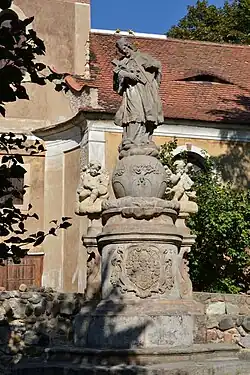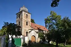 Dochovanou stavbou je kostel svatého Martina, jehož barokní podoba je výsledkem přestavby z konce sedmnáctého století.[23] Jižně od kostela se nachází sloup se sochou Panny Marie datovaný letopočtem 1694. Stojí na čtyřhranném soklu položeném na dvou pískovcových stupních. Samotnou sochu Panny Marie s Ježíškem v levé ruce nese hlavice zdobená volutami. U vchodu na bývalý kostelní hřbitov stojí socha svatého Jana Nepomuckého na mohutném půlkulatém soklu, který je na čelní straně zdoben erbem a datován letopočtem 1724. Vlastní socha stojí na velké pískovcové kouli zdobené plastikou svržení Jana z mostu. Vedle koule jsou dva andělé, kteří drží měšec a zámek. Anděl se zámkem si prstem na pravé ruce ukazuje na ústa.[24]