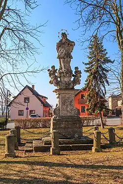 Uprostřed ohrazení se nalézá podstavec tvořený třemi pískovcovými schody, na kterých je umístěn hranolový profilovaný sokl, na něm stojí pilíř s profilovanými boky ozdobenými volutami s mušlemi a střapci a zakončený profilovanou římsou. Na čelní stěně pilíře se nalézá v obdélníkovém rámu reliéf klečícího světce s palmovou ratolestí (sv. Antonín Paduánský?), který objímá batole stojící na hranolovém podstavci. Výjev rámuje shora baldachýn. Na zadní straně pilíře se nalézá další reliéf sedícího svatého Josefa s Ježíškem, opět rámovaný baldachýnem.