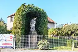 Pískovcová socha svatého Jana Nepomuckého stojí v zahradě domu při silnici a umístěna ve výklenku tvořeném zastřihováním vzrostlého keře zimostrázu.