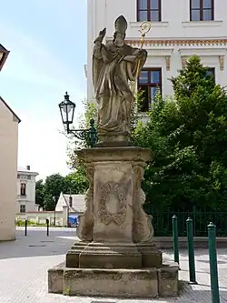 Socha je vytesána z pískovce a znázorňuje postavu světce v biskupském ornátě, drží biskupskou berlu a evangelium v levé ruce. Jeho pravá ruka je zvednuta v gestu požehnání.