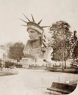 Přestože plány na sochu nebyly dokončeny, Bartholdi pokračoval ve výrobě pravé ruky, která nese pochodeň, a hlavy. Práce byly zahájeny v dílně Gaget, Gauthier & Co.[32] V květnu 1876 Bartholdi odcestoval do Spojených států jako člen francouzské delegace na Světovou výstavu a zařídil,[33] aby byl v New Yorku v rámci oslav stého výročí vystaven velký obraz sochy. Rameno dorazilo do Filadelfie až v srpnu; kvůli pozdnímu příjezdu nebylo uvedeno v katalogu výstavy, a zatímco některé zprávy dílo správně identifikovaly, jiné ho nazývaly „Kolosální rameno“ nebo B„artholdiho elektrické světlo“.[34] Na výstavišti byla řada monumentálních uměleckých děl, která se ucházela o zájem návštěvníků veletrhu, včetně nadrozměrné fontány navržené Bartholdim.[35] Přesto se rameno ukázalo jako populární i v posledních dnech výstavy a návštěvníci vystupovali na balkon pochodně, aby si prohlédli výstaviště.[36] Po skončení výstavy byla paže převezena do New Yorku, kde byla několik let vystavena v Madison Square Parku, než byla vrácena do Francie a připojena ke zbytku sochy.[36]