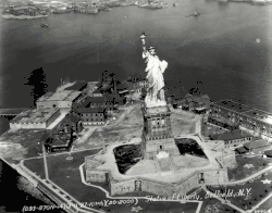 Bedloe's Island v roce 1927, socha a vojenské budovy. Viditelný je jedenáctiúhelníkový půdorys zdí Fort Wood, které dodnes tvoří základnu sochy