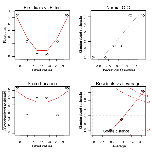 > plot(lm_1) # Diagnostické vykreslení regresního modelu