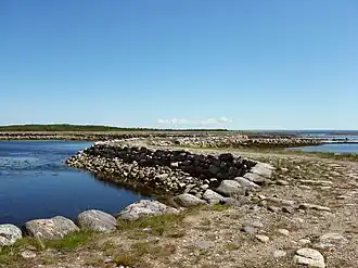 Jediný ostrov, na který je možno přejít ze Soloveckého ostrova suchou nohou, je Velká Muksalma. Vede na něj 1,2 km dlouhá hráz, zbudovaná v polovině 19. století navršením balvanů. Tato impozantní stavba sloužila především pro přesuny dobytka chovanéno na Velké Muksalmě nezávisle na počasí. Cesta po ní je proto dostatečně široká, okolo 6 metrů. Proudící mořskou vodu propouští uprostřed tři klenuté propusti. Spolu s touto hrází byla zbudována i hráz na ostrov Malá Muksalma (z Velké Muksalmy), ta se však plně nedochovala a je dnes vidět pouze při odlivu.[6]
