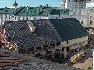 (zleva) chrám Zesnutí přesvaté Bohorodice s jídelnou, zvonice, chrám sv. Mikuláše a chrám Proměnění Páně -