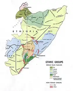 Klany jsou rozšířeny bez ohledu na státní hranice a přátelské či nepřátelské vztahy mají tradice staletých zkušeností.[1] Příslušnost ke klanu, který odvozuje svoji existenci od společného zakladatele nebo předka, je základní a nejdůležitější identitou Somálce. Jazykově ani antropologicky se klany významně neliší. Právě klanová struktura je příčinou častých etnických nepokojů a občanské války. Nelze však říci, který klan je více pronásledován nebo ustrkován. Vždy bude záležet na místě a regionu, ve kterém se násilnosti, či diskriminace odehrávají, jaké jsou místní zkušenosti s příslušníky jiných klanů.