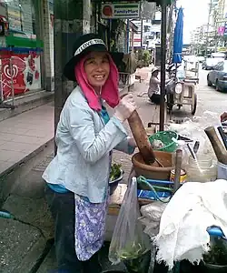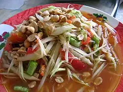 Salát z nezralé papáji má původ v Laosu a do středního Thajska se dostal díky laoským dělníkům, kteří tam přišli za prací.