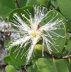 Na koncích větví vyrůstají jednotlivě nebo až po třech bílé až narůžovělé, oboupohlavné, šesti až osmičetné květy velké asi 5 cm. Vytrvalý, zvonkovitý kalich má vejčité plátky vně zelené a uvnitř načervenalé, za květu vzpřímené a za plodu zpět ohnuté. Korunní plátky jsou bílé či narůžovělé, čárkovité, zkadeřené a brzy opadávají, v chladnější oblastech většinou zcela chybějí. Ve květu je mnoho (okolo sta) volných tyčinek s bílými nitkami (odtud druhové jméno "bílý") a drobnými prašníky, deseti až osmnáctipouzdrý svrchní semeník a jedna dlouhá čnělka přečnívající tyčinky. Květy se otvírají v noci, opylují je noční motýli a netopýři či kaloni přilétající pro nektar i pyl; s nástupem rozednění korunní lístky i tyčinky opadávají. Při nedostatku opylovačů může dojít i k samoopylení. Stromy obvykle kvetou průběžně po celý rok.