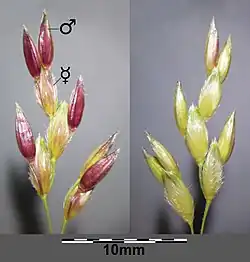 Na konci stébla se vytváří řídké, hodně větvené květenství kuželovitého tvaru, lata klásků dlouhá 10 až 40 cm a široká do 10 cm. Ve tří a více četných přeslenech vyrůstají nad sebou primární větve květenství, vespod jsou až 25 cm dlouhé a dále se dělí do větví sekundárních a některé i terciárních. Květenství je tvořeno převážně dvoukvětými klásky, pouze v horní části květenství rostou klásky se třemi květy. Ve dvoukvětém je horní květ přisedlý, oboupohlavný a někdy purpurově zbarvený, kdežto spodní je krátce stopkatý a sterilní; případný třetí květ má stopkou a je vybaven pouze prašníky. Klásek je vejčitě kopinatý, bývá asi 5 mm dlouhý a někdy mívá snadno opadávající osinu. Oboupohlavný květ má tři tyčinky, jednobuněčný horní semeník a dvě peříčkovité blizny. Blanité plevy jsou zašpičatělé, žlutohnědé a obě jsou si podobné, pluchy se dvěma zuby jsou někdy zakončené až 1 cm dlouhou osinu.