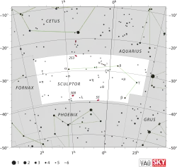 Asi 4° jižně od hvězdy Alfa Sculptoris leží střed elipsovité trpasličí galaxie Sculptor.