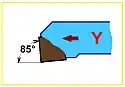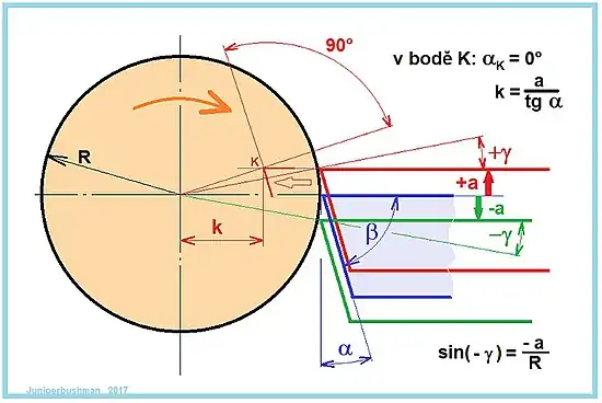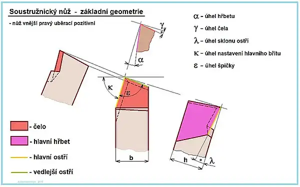 Soustružnický nůž představuje typickou geometrii řezných nástrojů. Úhly se vztahují k ose stopky nástroje. To znamená, že řezná geometrie při vlastním obrábění může být jiná než geometrie nože, jednak podle polohy stopky vůči ose obrobku (natočení nože), jednak podle polohy špičky vůči ose obrobku (pod nebo nad). Geometrie břitu je optimalizována pro polohu špičky břitu v ose obrobku. Pokud ustavíme špičku nad osu o míru , pak se při přibližování špičky k ose obrobku bude zmenšovat úhel hřbetu, až ve vzdálenosti bude nulový a hřbet začne dřít o obrobek. Naopak, při ustavení špičky pod osu se nepříznivě zmenšuje úhel čela o úhel .