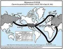 Sovětskému svazu v jeho válečném úsilí výrazně pomohly Spojené státy prostřednictvím zákona o půjčce a pronájmu (Lend-Lease). Celkem americké dodávky do SSSR prostřednictvím Lend-Lease činily 11 miliard dolarů v materiálu: přes 400 000 džípů a nákladních aut; 12 000 obrněných vozidel (včetně 7 000 tanků, z toho asi 1 386[7] ks M3 Lee a 4 102 M4 Sherman);[8] 11 400 letadel (z toho 4 719 Bell P-39 Airacobra, 3 414 Douglas A-20 Havoc a 2,397 ks Bell P-63 Kingcobra)[9] a 1,75 milionu tun potravin.[10]