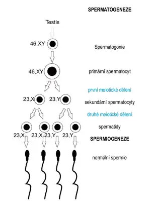 Spermatogeneze je tvorba mužských pohlavních buněk (spermií). Pro správný průběh spermatogeneze je zapotřebí dostatečná stimulace pohlavními hormony (zejména testosteronem) a dále nižší teplota, jíž je docíleno umístěním varlat v šourku. Tvorba spermií má tři fáze: rozmnožovací, růstovou a zrání. Na počátku vývoje spermií jsou spermatogonie, což jsou samčí prapohlavní buňky. Mají kulovitý tvar a jsou uloženy na okrajích semenných kanálků. Spermatogonie se mitoticky dělí. Jednak aby zachovaly své početní stavy a jednak jejich dělením vznikají primární spermatocyty (spermatocyty I. řádu), které leží nad vrstvou spermatogonií. Primární spermatocyty jsou diploidní, avšak po prvním meiotickém dělení z nich vznikají haploidní sekundární spermatocyty (spermatocyty II. řádu). Ty mají stále zdvojené chromatidy, proto záhy dochází k druhému meiotickému dělení, jehož produktem jsou spermatidy. Spermatidy jsou již plně haploidní a dále se nedělí. Spermatidy poté prochází procesem spermiogeneze, při kterém dochází ke kondenzaci jádra, vytvoření bičíku a ztrátě většiny cytoplazmy a některých organel. Nezralé spermie putují přes semenotvorné kanálky do nadvarlete, kde dochází k jejich definitivnímu zrání. Celý tento proces trvá asi 72 dní (± 2 dny).[1] Spermatogeneze probíhá od puberty do individuálně vysokého věku a odhaduje se, že muž za svůj život vyprodukuje cca 12 biliónů spermií.