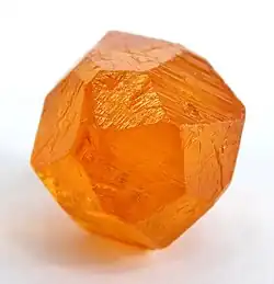 Spessartin je minerál krystalizajicí v soustavě kubické jako rombododekaedr nebo hexaoktaedr.[1] Častý výskyt nepravidelných zrn. Patří ke skupině gránátů (pyrop, almandin, spessartin, grosulár, andrandit, uvarovit). Byl pojmenován podle lokality Spessart v Německu, kde byl poprvé objeven.